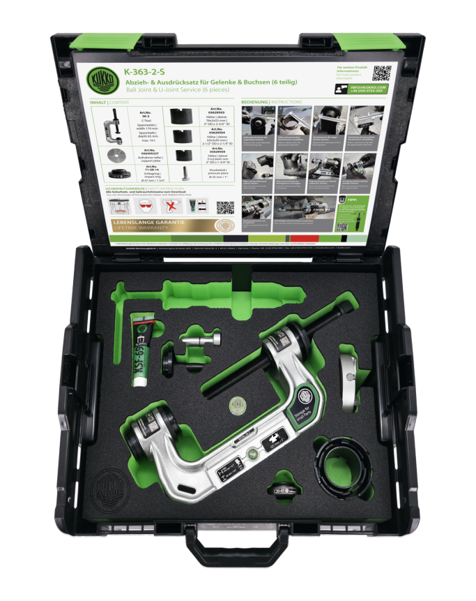 Zum schnellen Ein- und Auspressen von allen gängigen Achsschenkelbolzen an Nutzfahrzeug-Vorderachsen in Werkstatt, Industrie und Automotive.